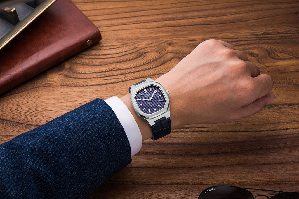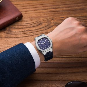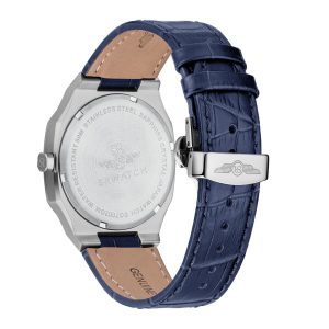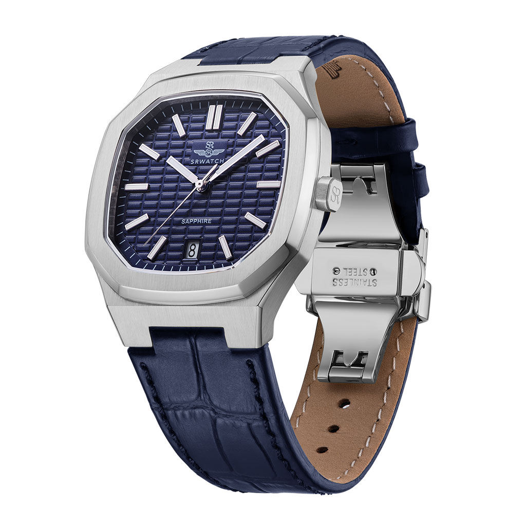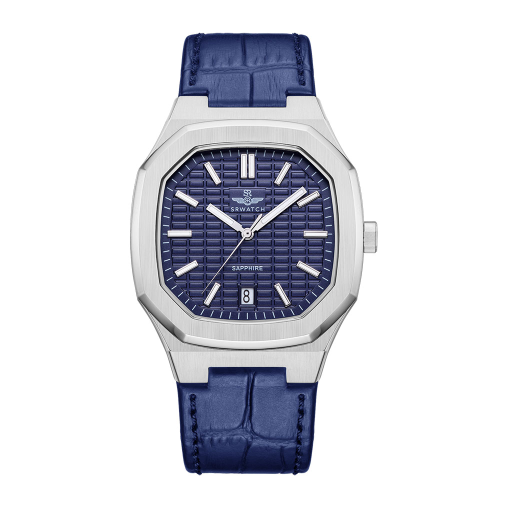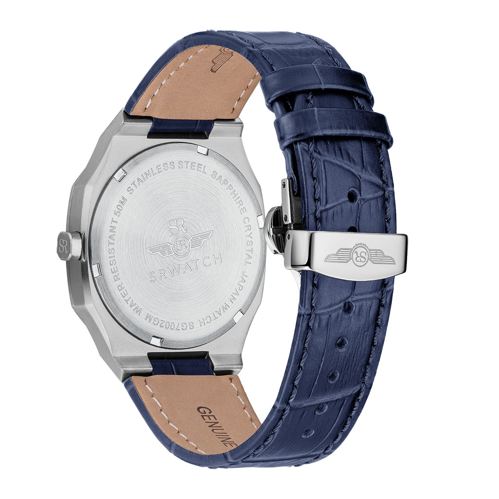 Men’s watch SRWATCH SG7002.4103GM blue face, white case, roman numeral markers and 3 prominent hands on a blue background. The dial features a timeless stainless steel case, paired with a premium grained blue leather strap. The Sapphire curved glass effectively resists scratches, and the 5ATM water resistance standard provides peace of mind for users.