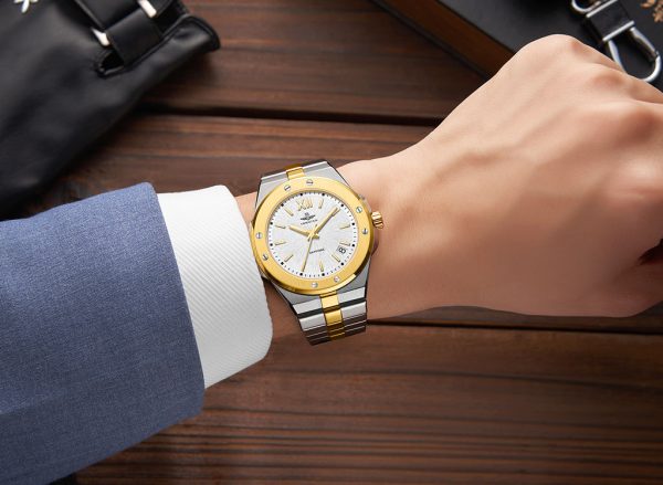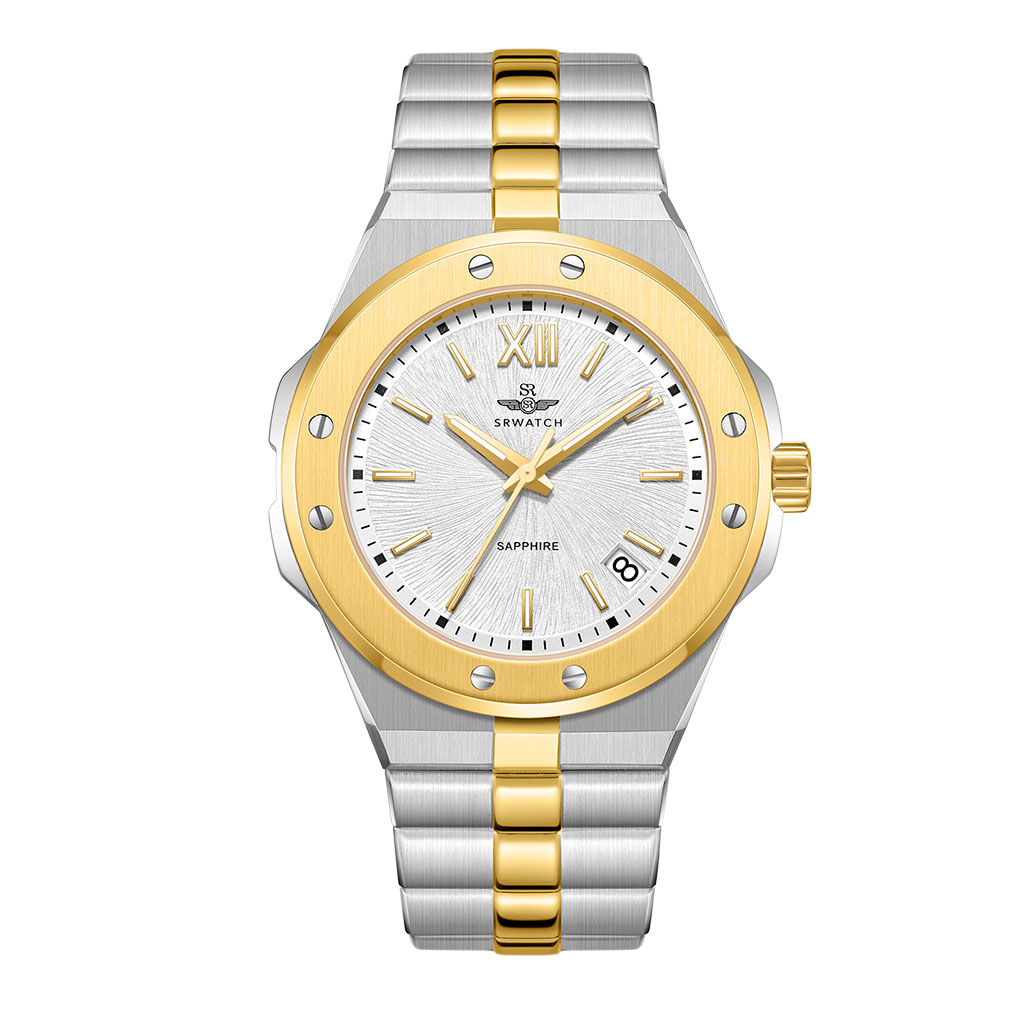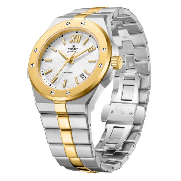 SRWATCH SG7009.1202GM men’s watch with round face, white case with gold border, gold-plated numbers and 3 hands standing out on the white background of the watch. The watch face has a white-plated stainless steel case with PVD gold border, combined with a stainless steel strap. Scratch-resistant sapphire crystal and 5ATM water resistance bring peace of mind to the user.