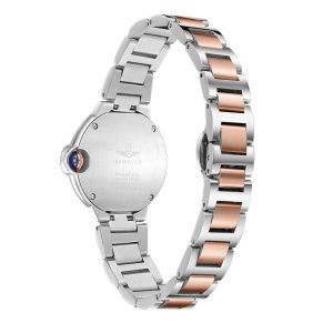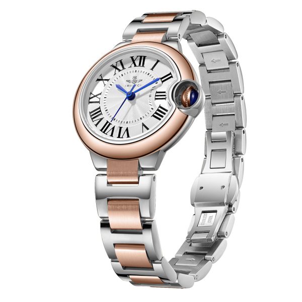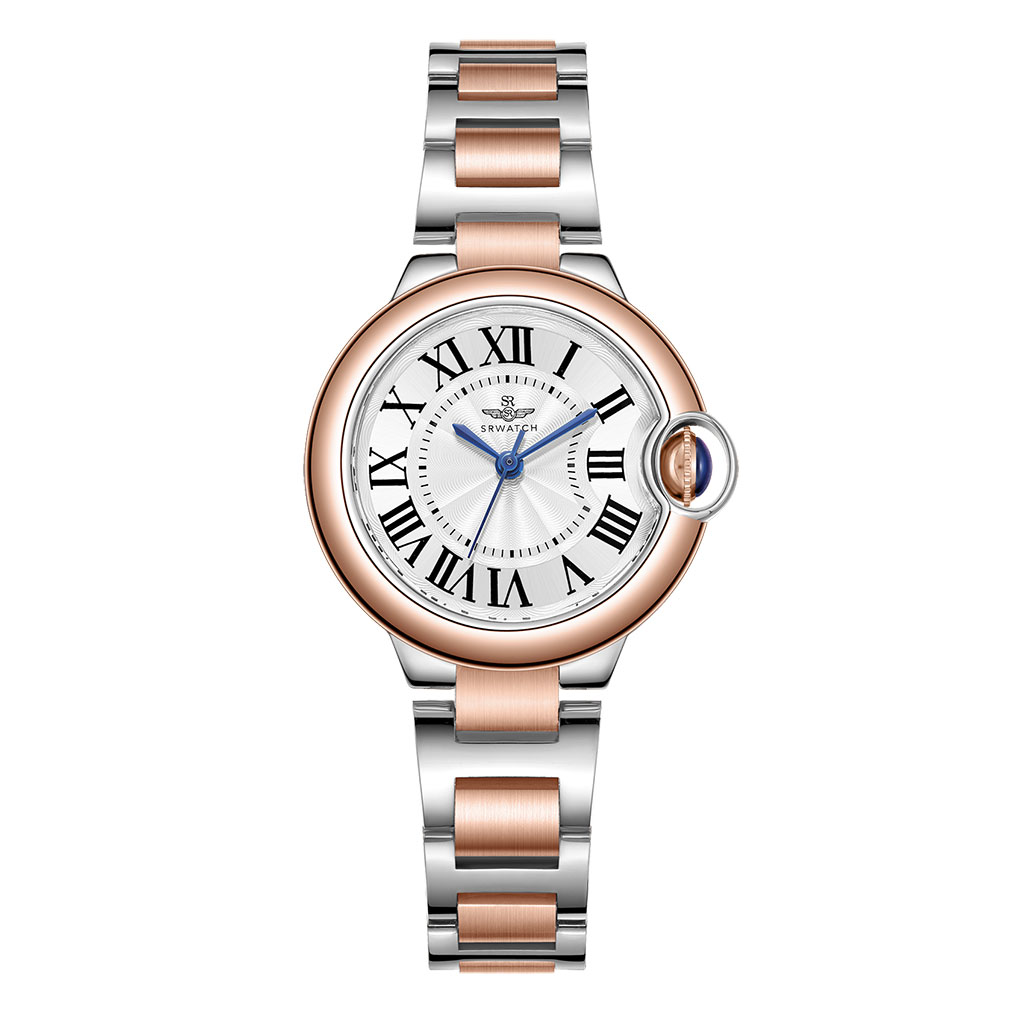SRWACTH SL5012.1502BL women’s watch with round face, rose gold and white case, Roman numerals and 3 blue hands stand out on a white background. The watch face is combined with a high-quality stainless steel strap plated in two colors of rose gold and white PVD. Scratch-resistant sapphire crystal and 5ATM water resistance bring peace of mind to the user.