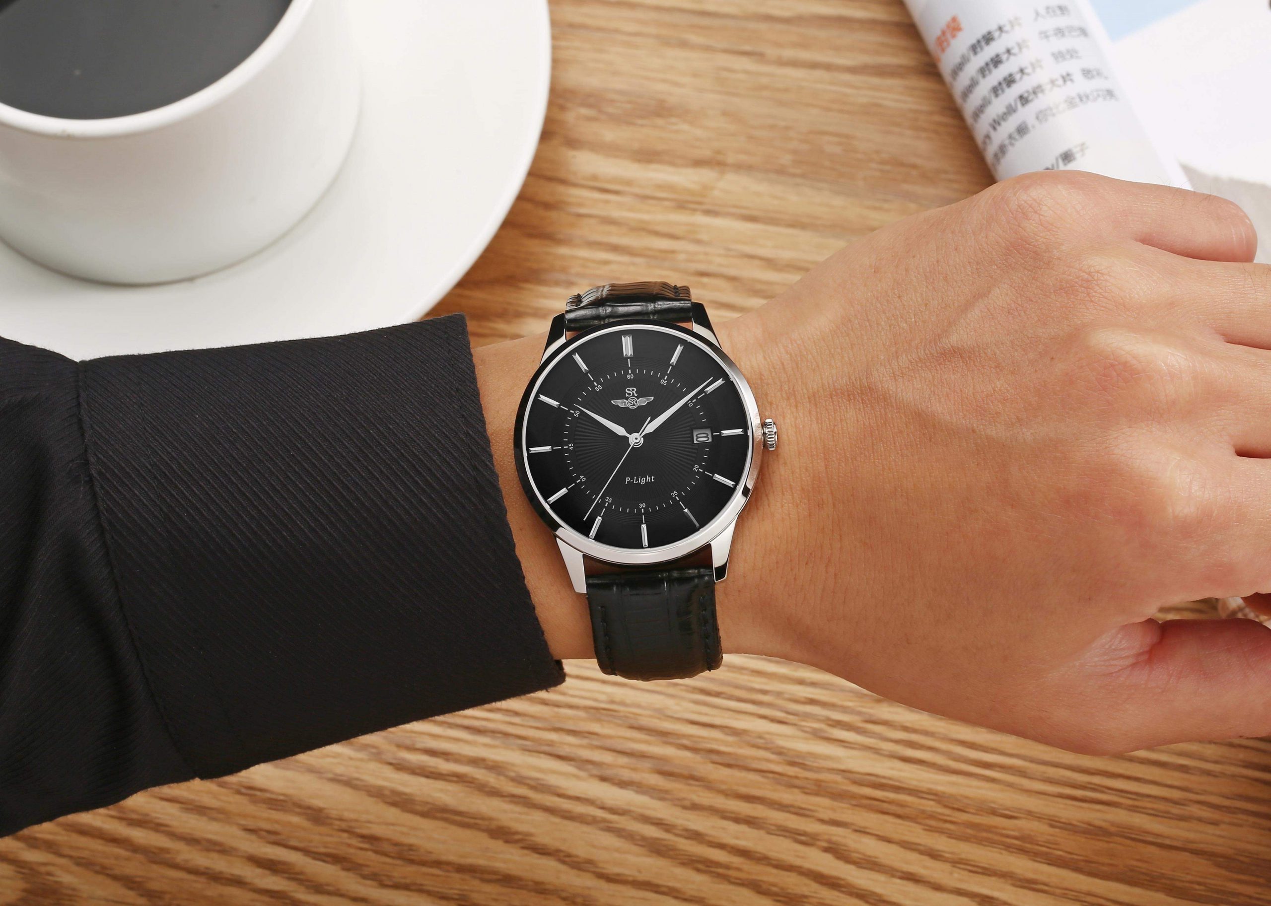 The SRWATCH SG10060.4101PL Black CV men’s watch features a round face design and premium black leather strap. The polished stainless steel (316L) dial and buttons stand out against an elegant black background. The SG10060.4101PL uses Japanese SOLAR MOVT battery technology (using energy batteries to absorb light). This model has scratch-resistant curved glass and 5atm water resistance.