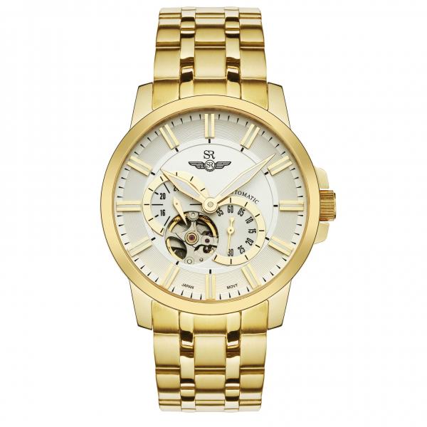 SRWATCH SG8871.1402メンズウォッチは、丸い文字盤、角張った斜めの針を備えたエレガントなデザインスタイルで、ナンバーラインは文字盤の背景の下に目立つペアラインの形で作られ、非常に男性的なムーブメント、フレーム、豪華な金メッキの金属ストラップが見えます。