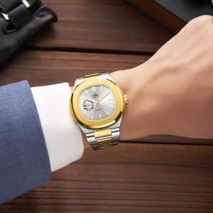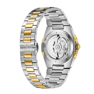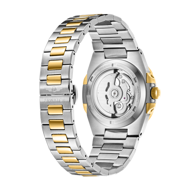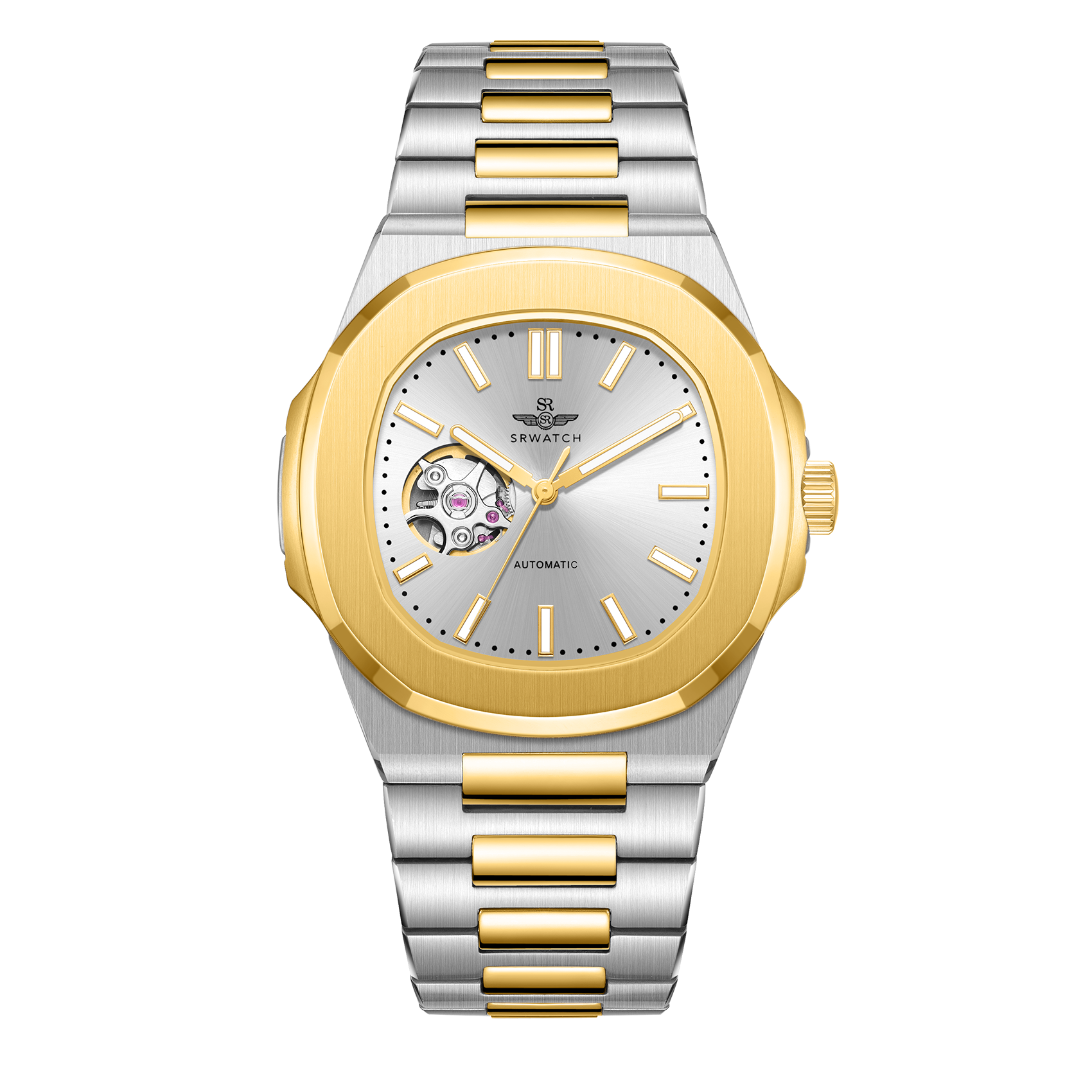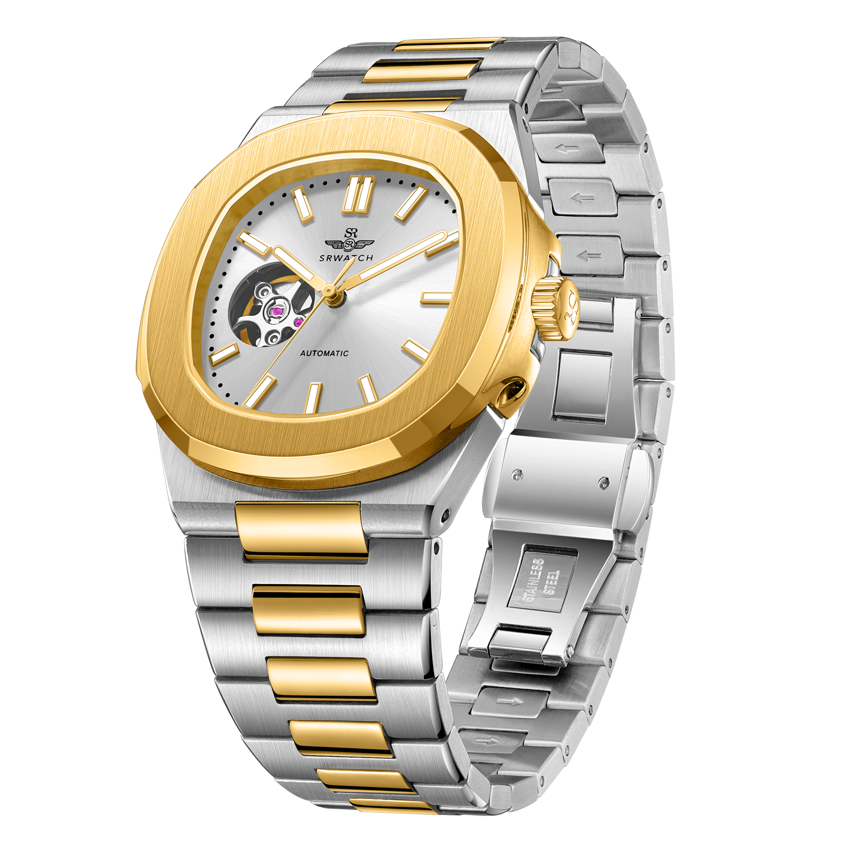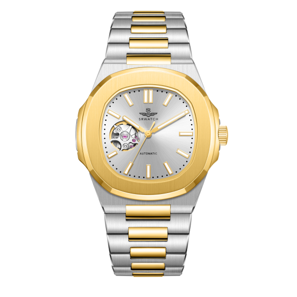 SRWACTH SG88804.1202AT men’s watch with oval face, gold case, thin hour markers and 3 white hour hands with luxurious silver dial. The watch face is combined with a high-quality PVD stainless steel strap, plated in two colors of gold and white. The automatic watch has a skeleton design that makes a difference. Scratch-resistant sapphire crystal and 5ATM water resistance bring peace of mind to the user.
