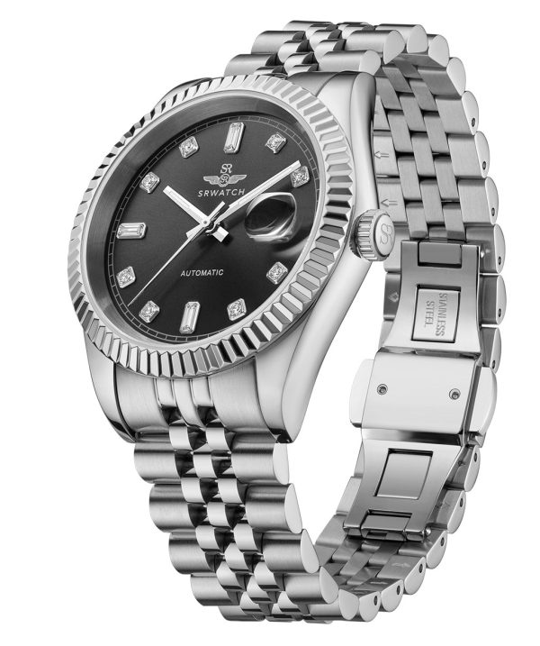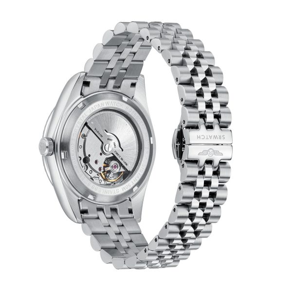 SRWACTH SG88805.1101ATメンズウォッチは、ラウンドフェイス、ホワイトケース、細身のインデックス、そしてブラックの背景に映えるホワイトの3針が特徴です。ケースには、高品質のPVD加工を施したステンレススチールストラップが組み合わされています。この自動巻きウォッチは、傷に強いサファイアクリスタルと5気圧防水を備え、ユーザーに安心感を与えます。