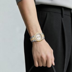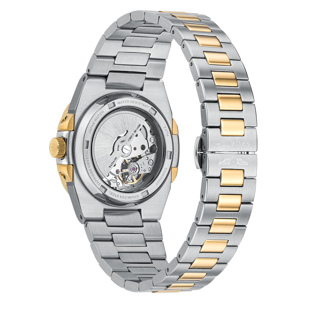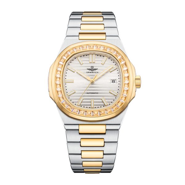 The SRWACTH SG88806.1202AT men’s watch has a gold case, hour markers and 3 white hands with gold edges that stand out on a sophisticated, luxurious white dial. The round watch face is surrounded by white stones to enhance its prominence, combined with a strap plated in two colors, gold and white, made of high-quality PVD stainless steel. The automatic watch has a scratch-resistant sapphire crystal and a 5ATM water resistance standard, giving the user peace of mind.