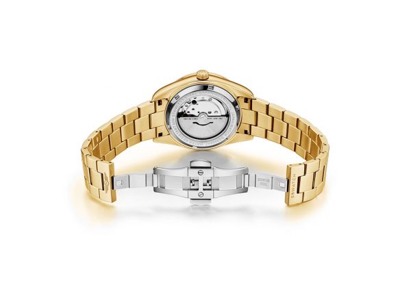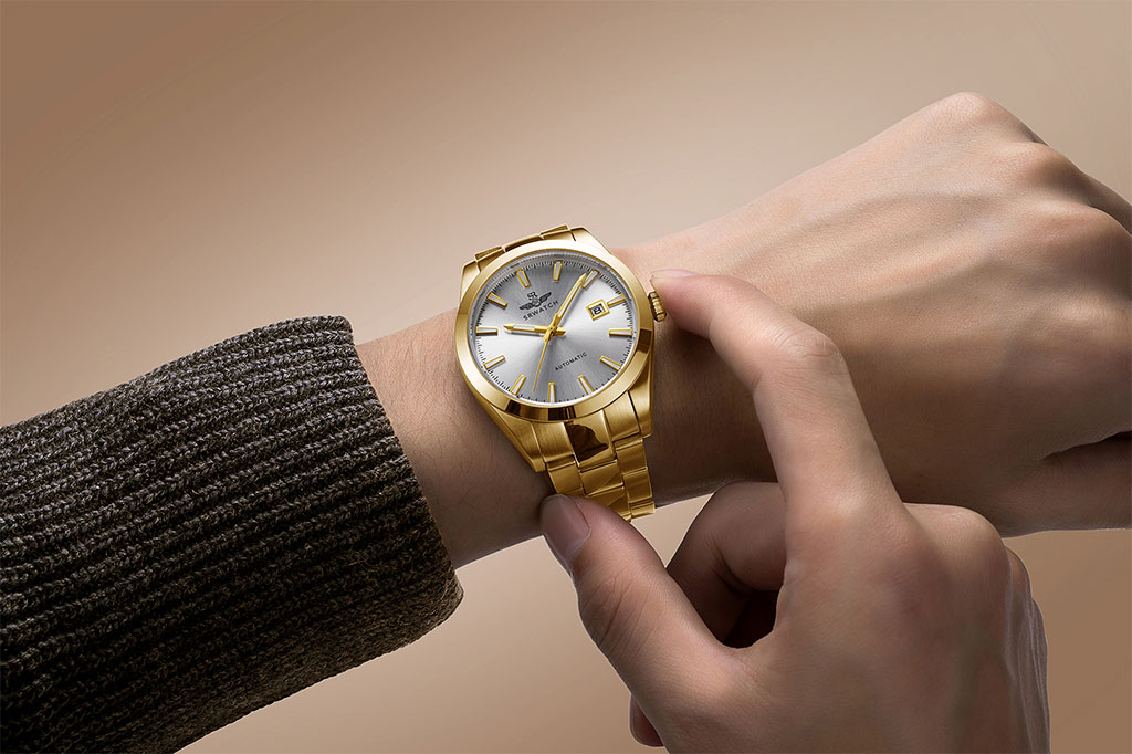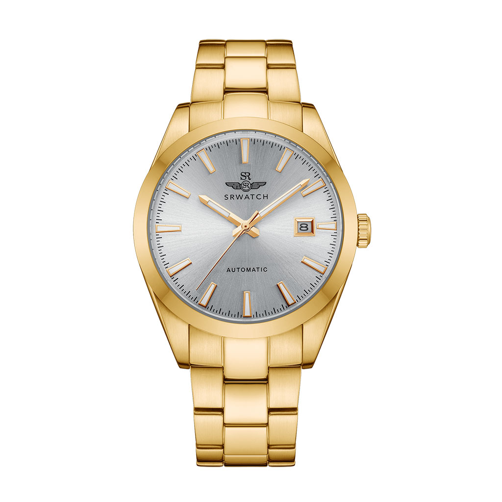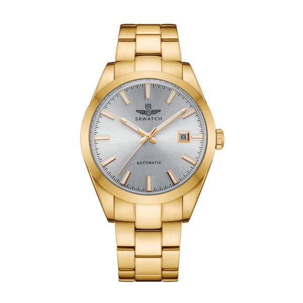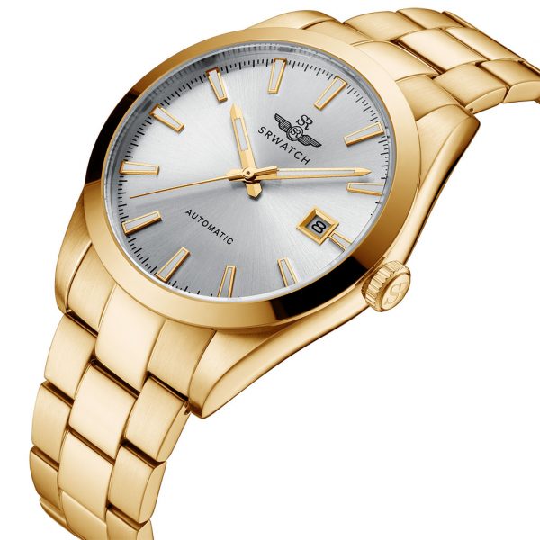 SRWATCH SG8888.1402AT men’s watch in white luxurious and eye-catching design with gold-plated stainless steel case and strap, sharp gold-plated indexes and hands on a luxurious white silver background, anti-reflective sapphire crystal. scratches, and has a date calendar included, 5ATM water resistance.