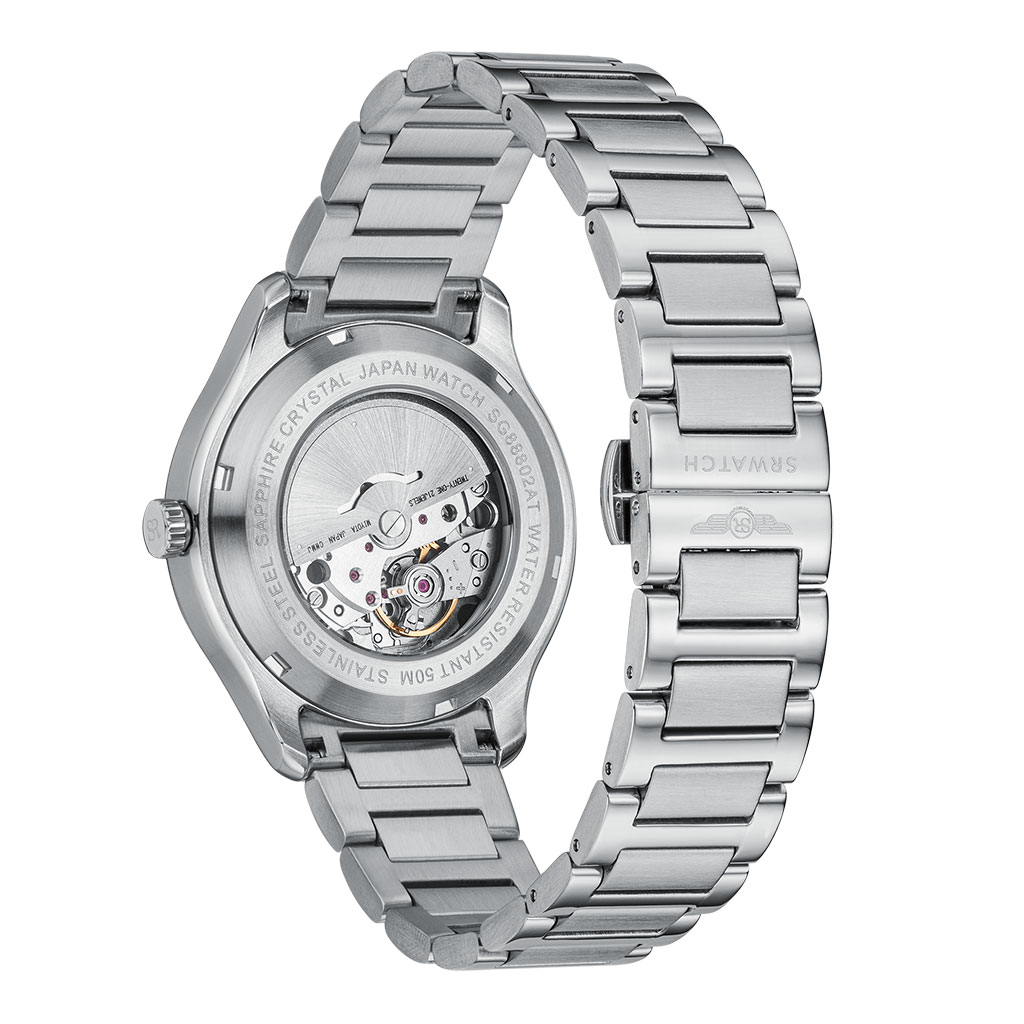 SG88802.1102AT men’s watch has a luxurious design with a strong stainless steel case and strap for men. The numbers and 3 slender hands are in harmony with the luxurious white background. The scratch-resistant curved sapphire glass surface, along with 5ATM water resistance, helps protect the internal mechanism to help users feel comfortable in all activities. The watch is equipped with a convenient date calendar.