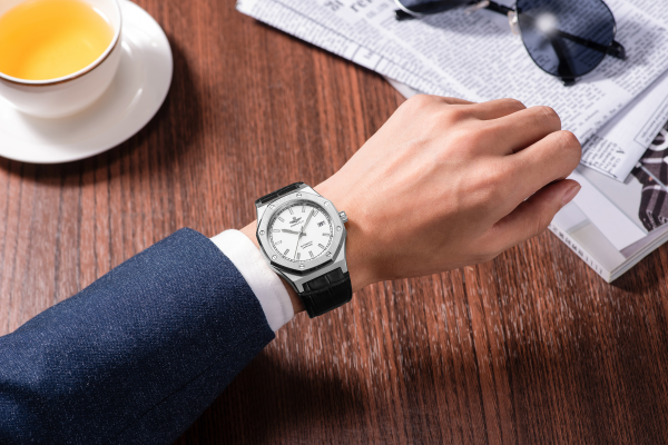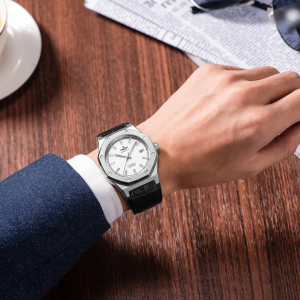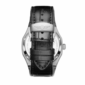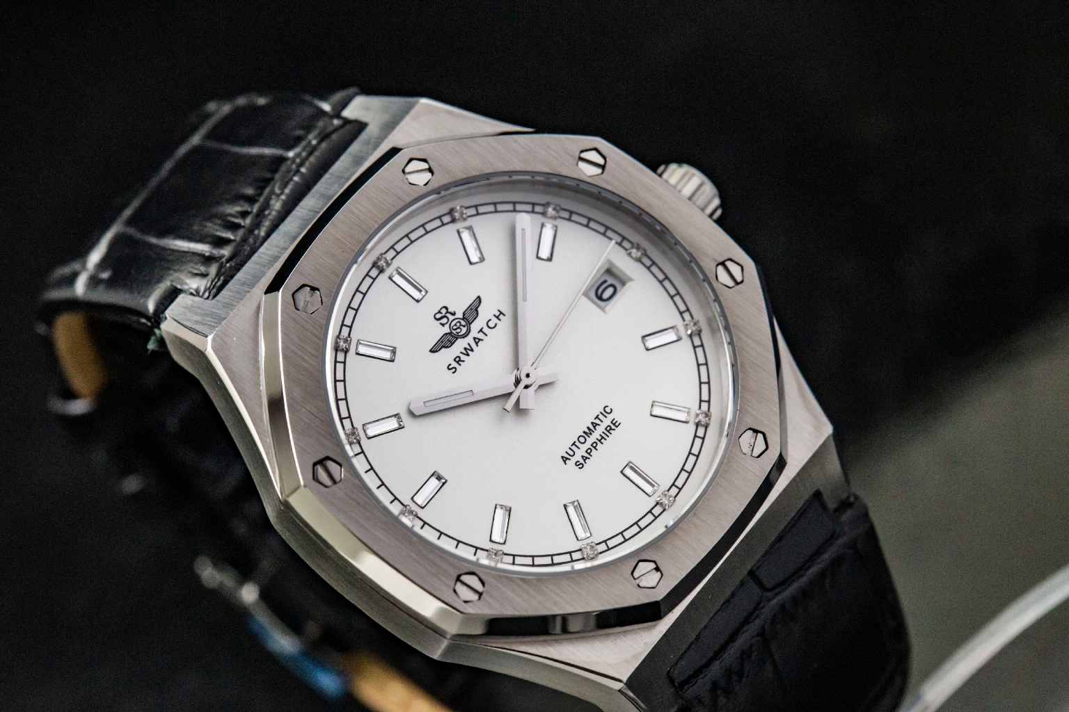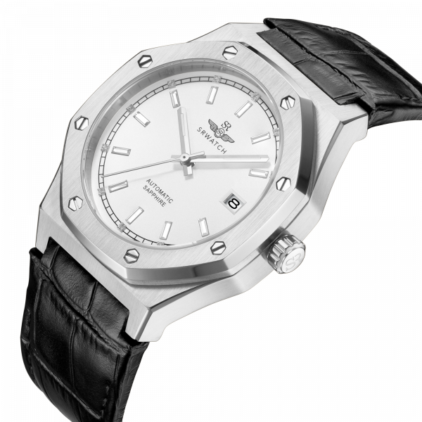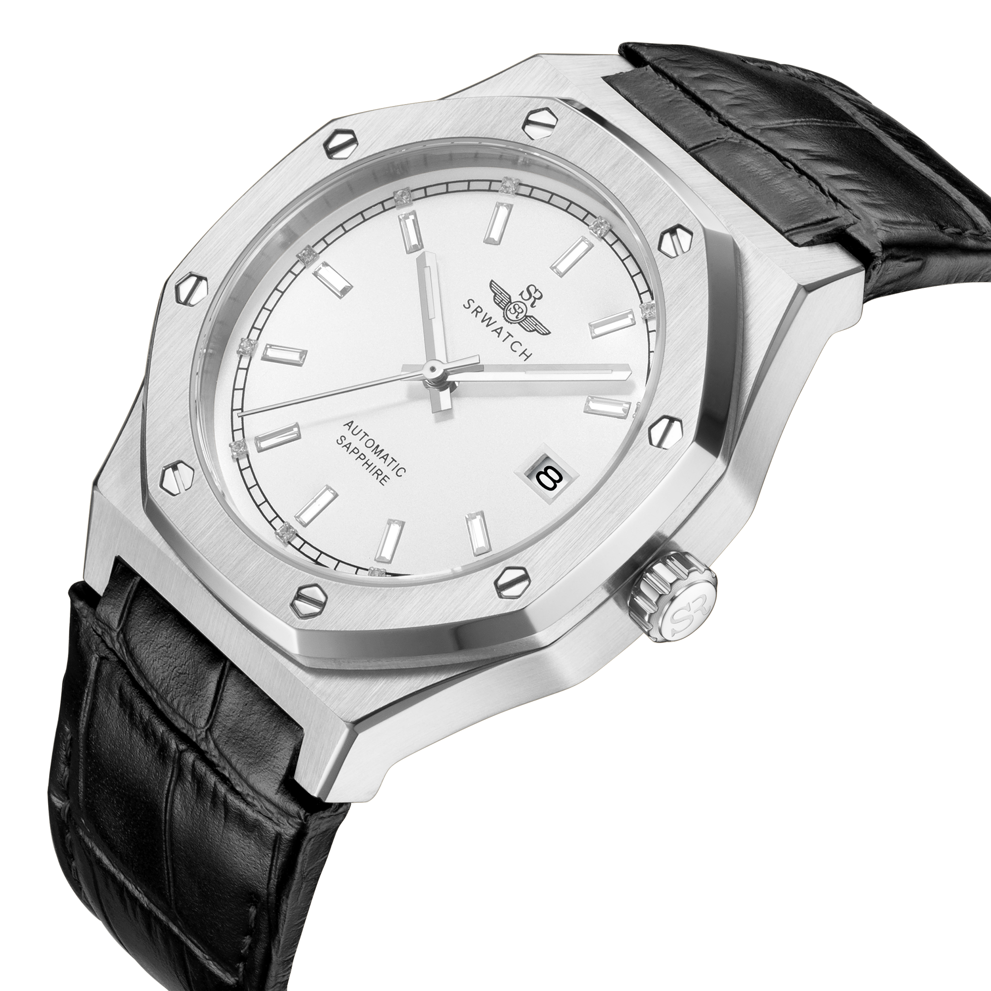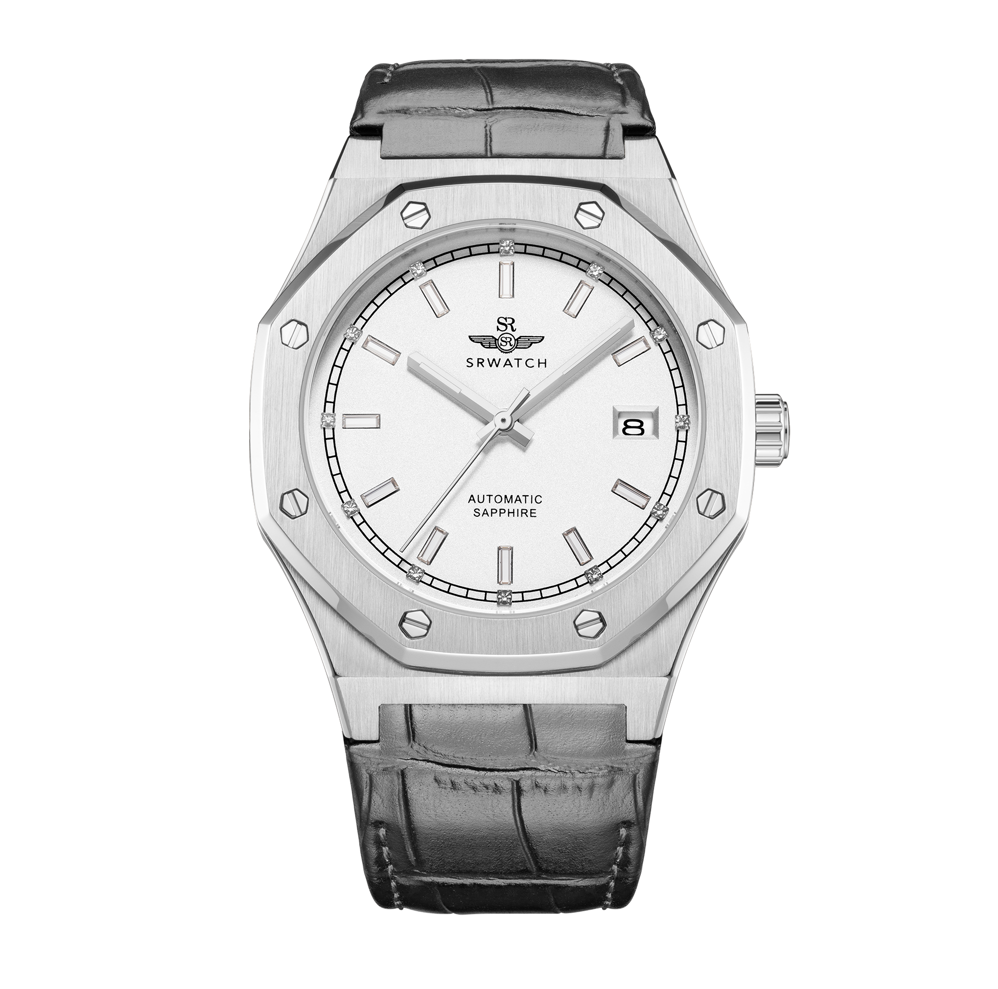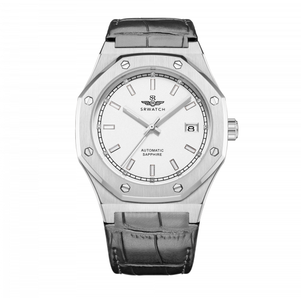 The SRWATCH SR SG99991.4102GLA features a white dial that harmoniously blends with the numerals decorated with luxurious stones to bring personality to the wearer; matte and polished gray stainless steel case; scratch-resistant sapphire glass—open SRwatch logo at 12-hour mark, black watch leather strap, day/date feature, and water resistance to 5atm.