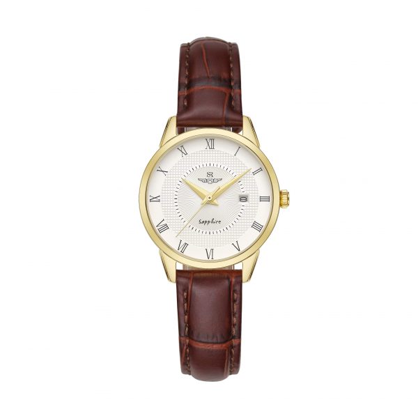 The SRWATCH SL1057.4602TE White CV Women’s Watch features a classic white round face design and premium brown leather strap. The case and knobs are available in polished PVD-technology gold-plated stainless steel with a vibrant silver finish. The dial designs 3 stories creating unique and fancy, Japanese Quartz battery technology, scratch-resistant curved glass, and 5atm water resistance.