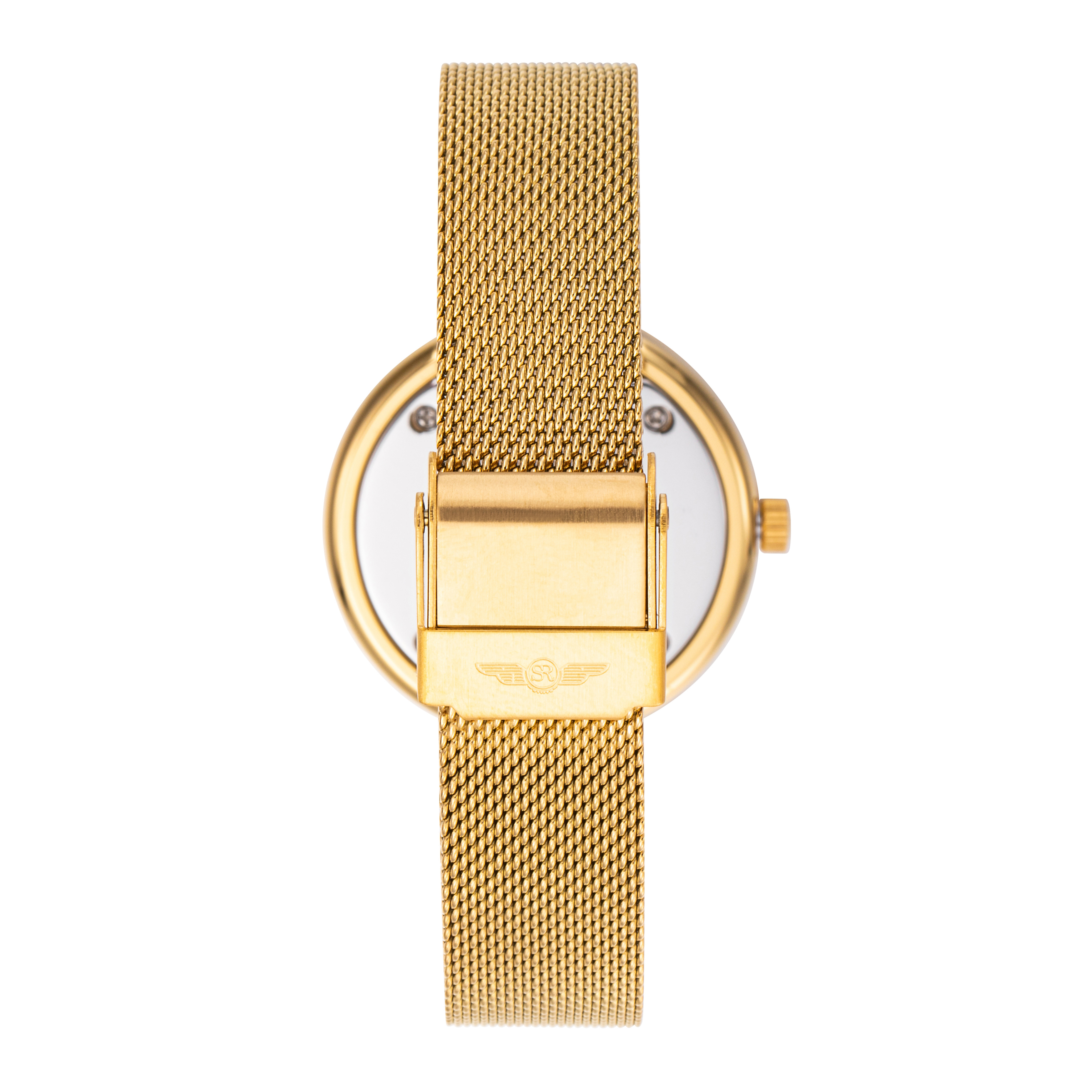 The SRWATCH SL5008.1401BL features stainless steel with 4 diamonds individually hand-set on dial elegance, a striking gold 2-hand dial, a stylish gold-plated bracelet with a mesh design, scratch-resistant sapphire glass, and water resistance to 5atm.