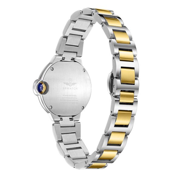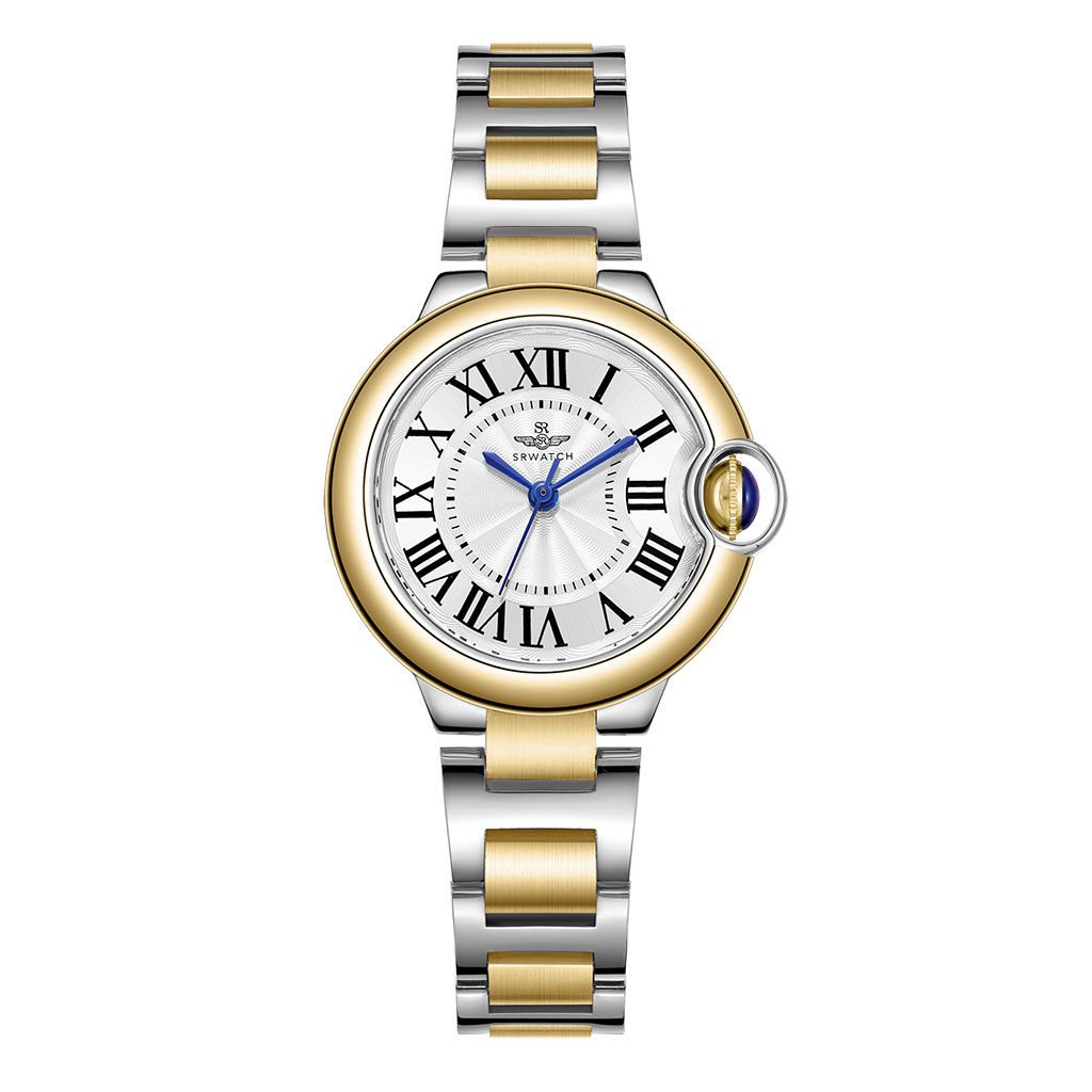 SRWATCH SL5012.1202BL men’s watch with round face, white gold case, Roman numerals and 3 blue hands standing out on a white background. The watch face and strap are made of PVD white gold-plated stainless steel. Scratch-resistant sapphire crystal and 5ATM water resistance bring peace of mind to the user.
