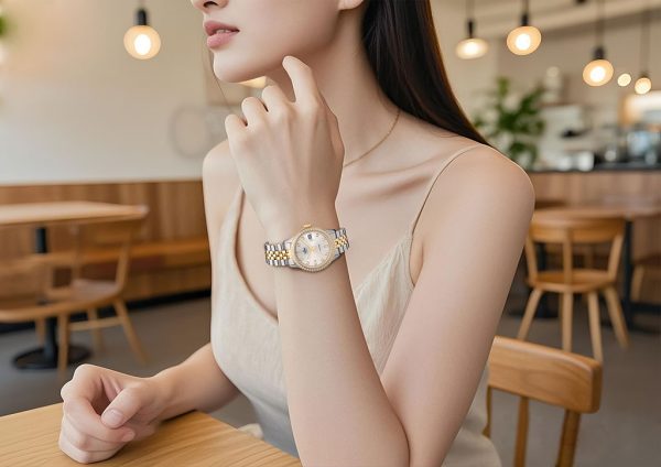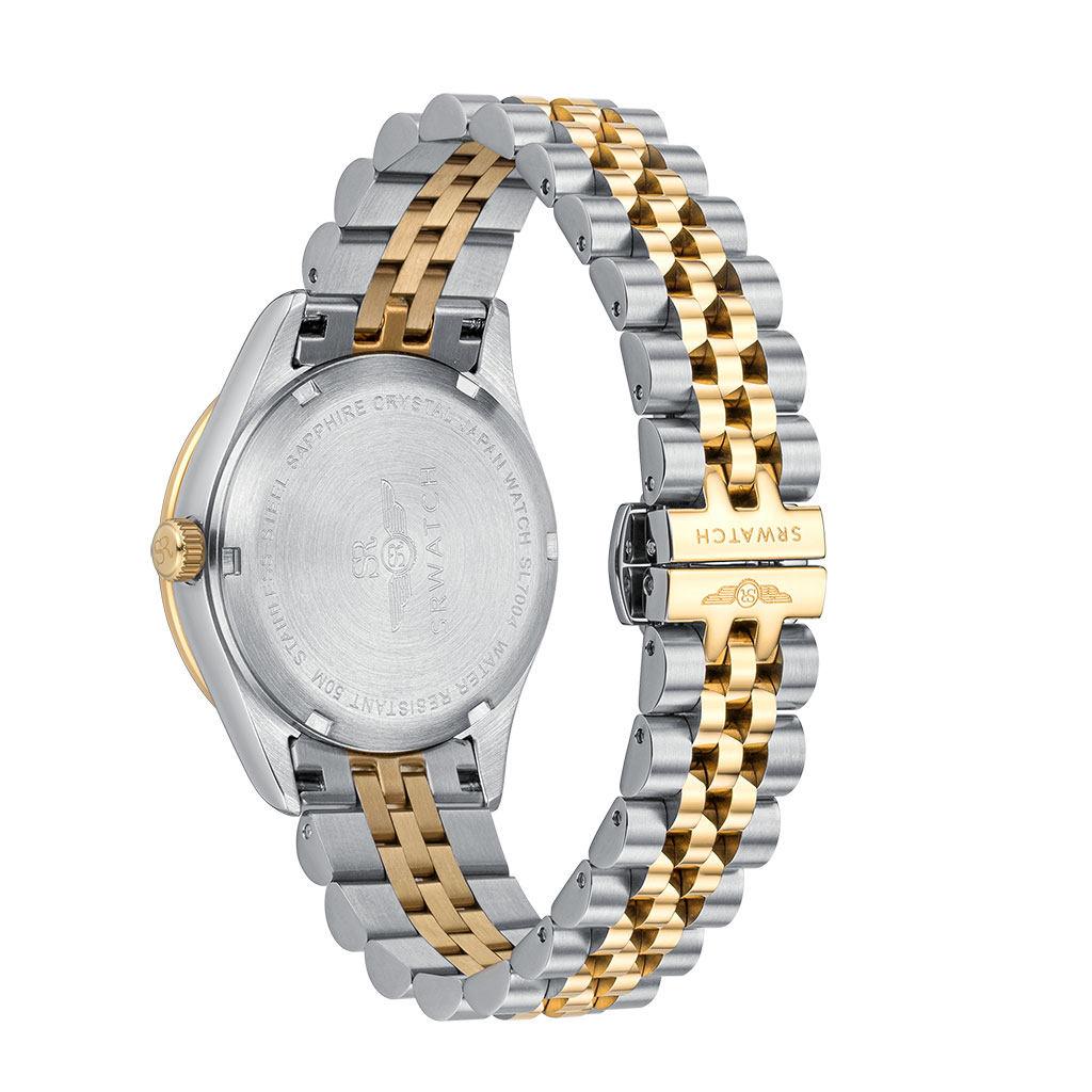 The SRWACTH SL7004.1202 women’s watch has a white case, diamond-studded hour markers and 3 gold-colored hands that stand out on a white dial, creating a luxurious look. The round watch face is surrounded by gold stones for added prominence. The high-quality PVD stainless steel strap is plated in two colors, gold and white, and the sapphire crystal is scratch-resistant. The watch uses a battery, has a convenient date calendar, and is 5ATM water-resistant, giving users peace of mind.